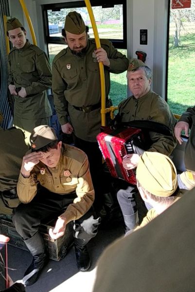 По дороге домой уфимцы могли услышать песни военных лет. В трамвае №5 актеры ТЮЗа устроили небольшое представление, исполнили фронтовые песни под гармонь и отрывки из произведения Твардовского. В троллейбусе №9 выступили артисты Дворца культуры «Моторостроитель» и ГДК, спев вместе с пассажирами песни военных лет.