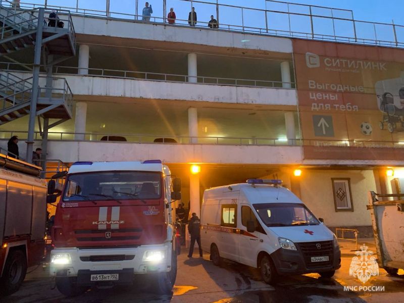Из здания торгового центра эвакуировали посетителей и сотрудников. Огонь на площади один квадратный метр в бытовом помещении на парковке потушили.