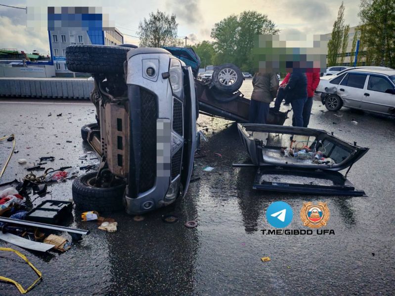 Две иномарки столкнулись в Уфе, одна машина перевернулась