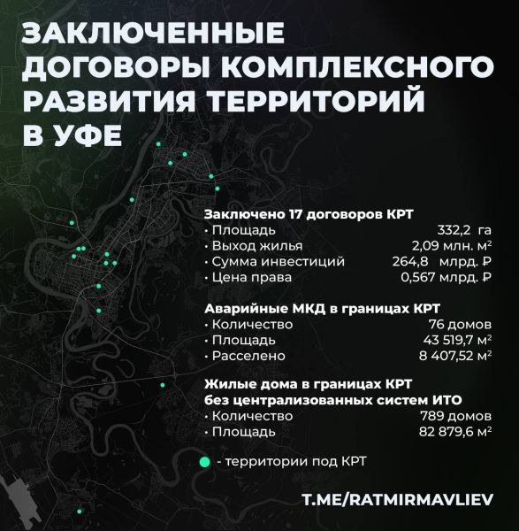 - Главное в КРТ для нашей команды - это улучшение жилищных условий уфимцев. В рамках договоров КРТ расположены 76 аварийных многоквартирных домов и 789 жилых домов без централизованных систем, - сообщил в соцсетях мэр Ратмир Мавлиев.