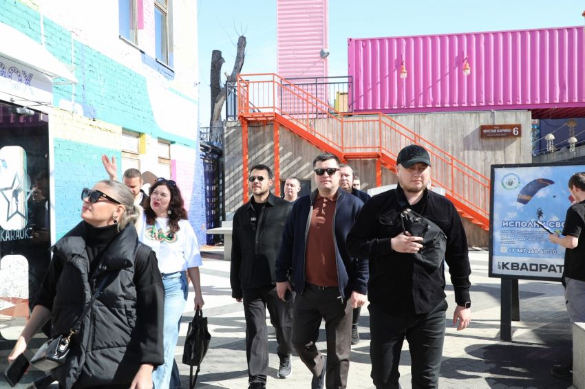 Для прогулки глава города выбрал атмосферное пространство «Арт-КВАДРАТ». В соцсетях Ратмир Мавлиев рассказал, что обсудил с гостем развитие креативных индустрий и создание современных общественных пространств.