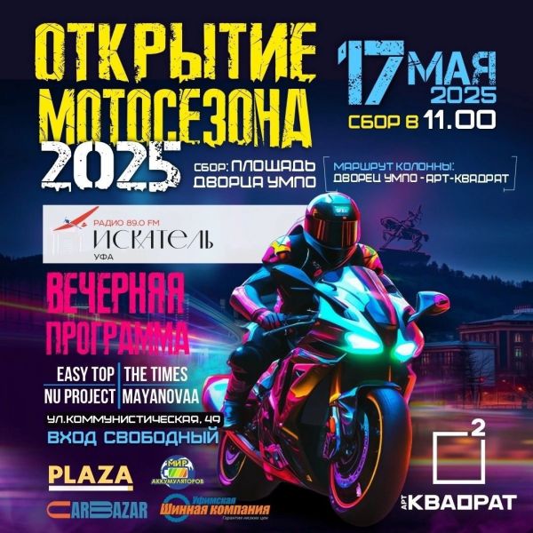 Завтра, 17 мая, в столице Башкортостана состоится официальное открытие мотосезона-2025. Праздник пройдет на площади перед ДК «Моторостроитель».